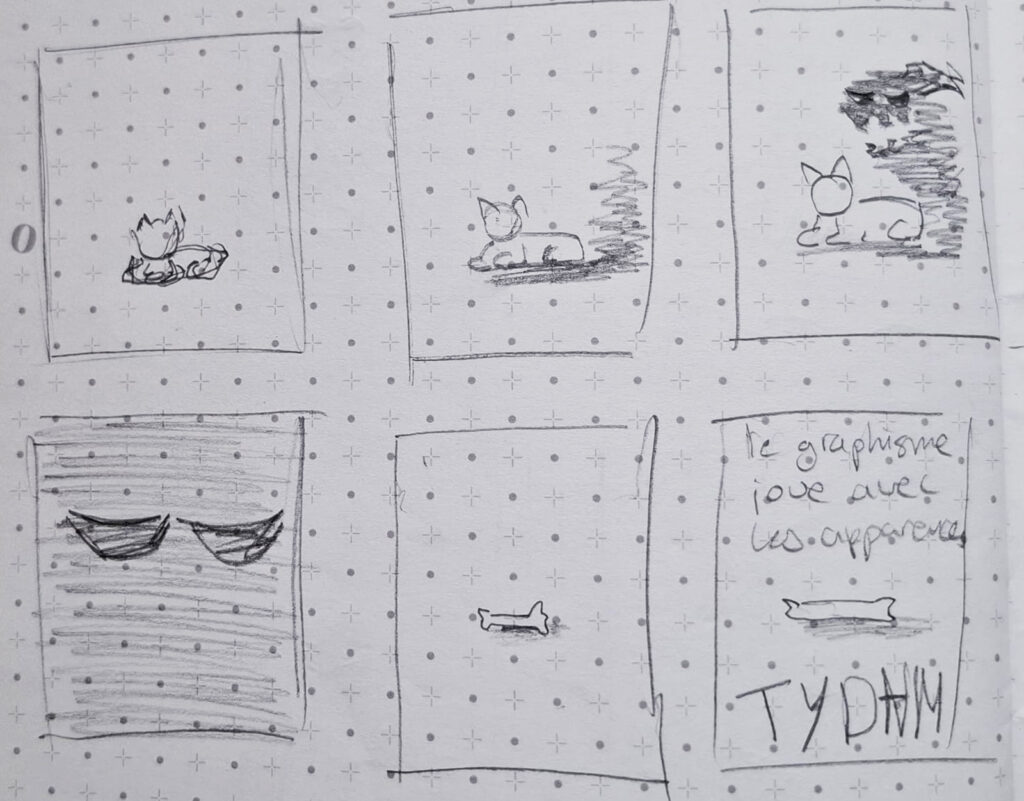 Pendant mon stage chez Tydam, on m’a demandé de concevoir un motion pour leurs réseaux sociaux avec une idée décalée et un peu flippante. J’ai imaginé un chat se faisant dévorer par son ombre qui le décortique progressivement, inspiré par l’esthétique de Michelle Ocelot (« Prince et Princesse »).