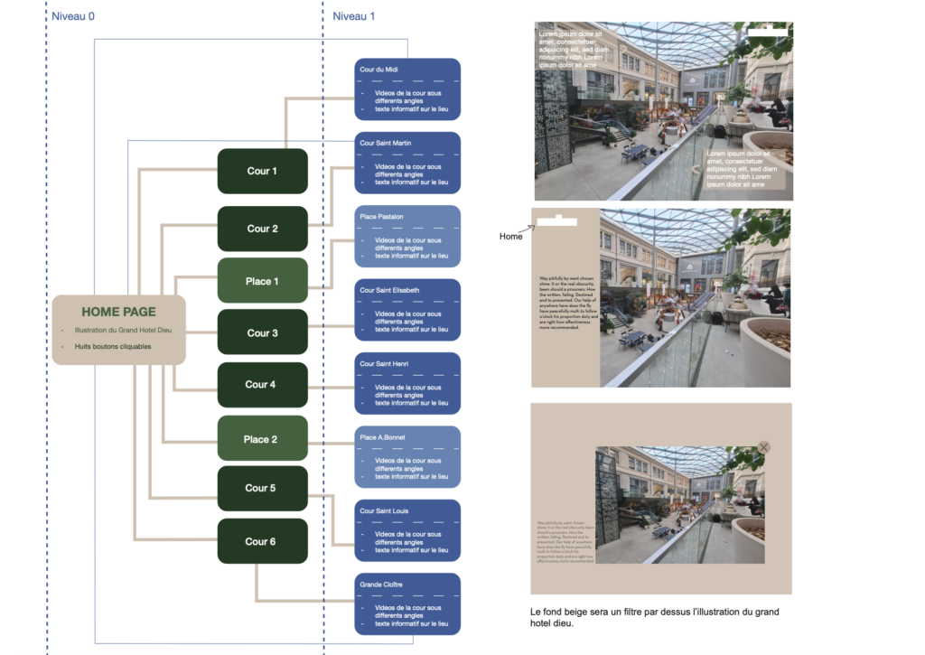 Le projet explore un parcours interactif mettant en valeur les caractéristiques historiques et architecturales du lieu à travers une navigation fluide et immersive. Réalisé avec Figma pour l’interface, Krita pour les illustrations et photos prises au Nikon Z6.