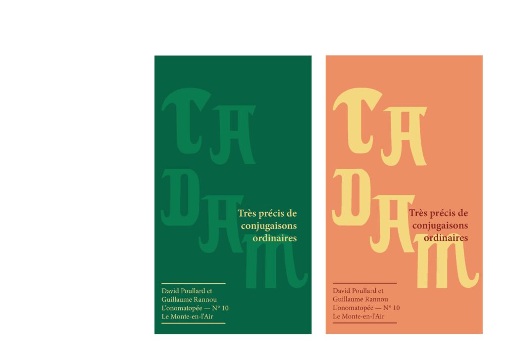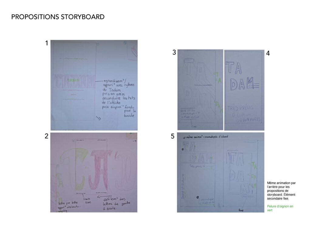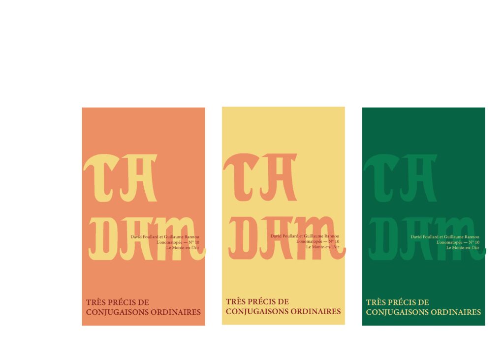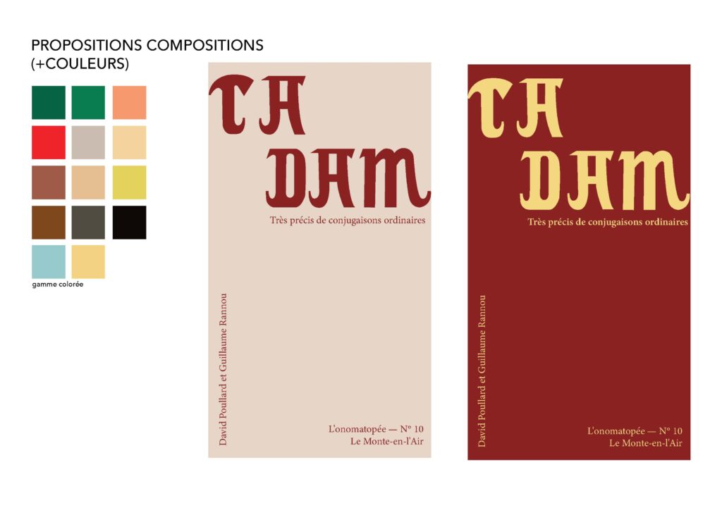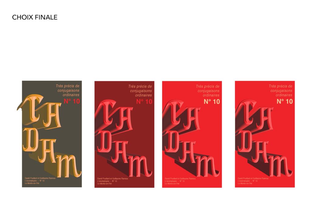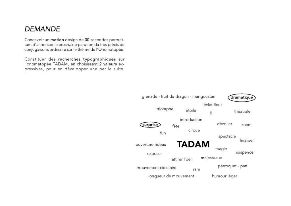 Je devais concevoir un motion design sous la forme d’une affiche animée annonçant la prochaine parution du Très précis de conjugaisons ordinaires, sur le thème de l’onomatopée. Le travail devait s’articuler autour de l’onomatopée « TADAM » et passer par l’exploration de deux pistes créatives distinctes.